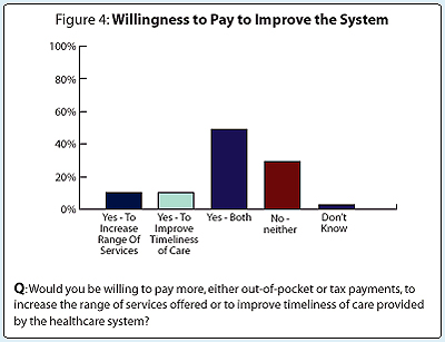Seven in 10 Canadians indicate that they are willing to pay more (either out of pocket or in taxes) to increase the range of services offered or to improve timeliness of care provided by the healthcare system, up from 56% who were willing to pay more to simply maintain the current system. Reforms that address the public's key concerns with the current system can persuade a larger portion of Canadians to open their wallet. But accountability will be key, and the public wants it built in, on the front end.