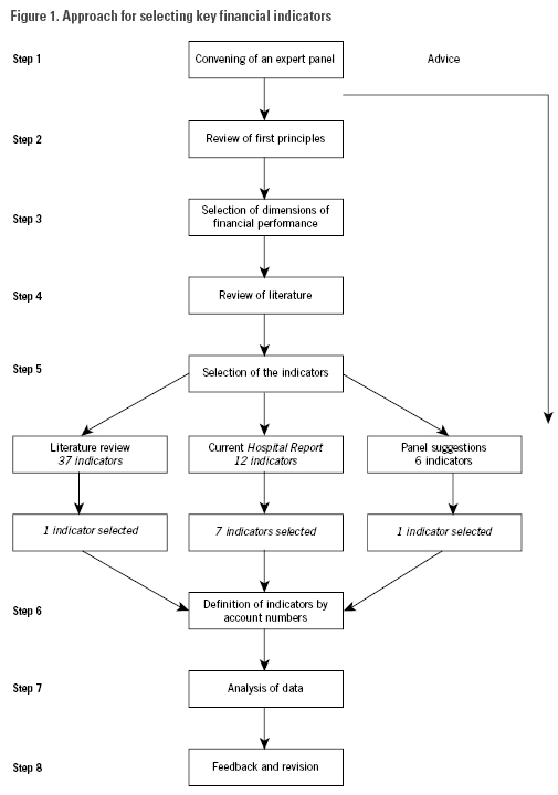 This article describes the method used to select key financial indicators for inclusion in Hospital Report. We describe the literature, panel and survey approach that was used, and we present the results for five years of recent data for Ontario hospitals.