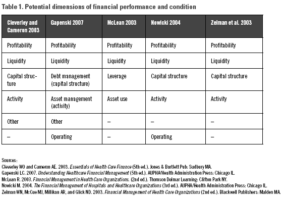 Various dimensions of financial performance were identified from the five top-selling textbooks on healthcare financial management, which appear in Table 1. In the end, the expert panel decided to retain the current dimensions of financial performance and condition: