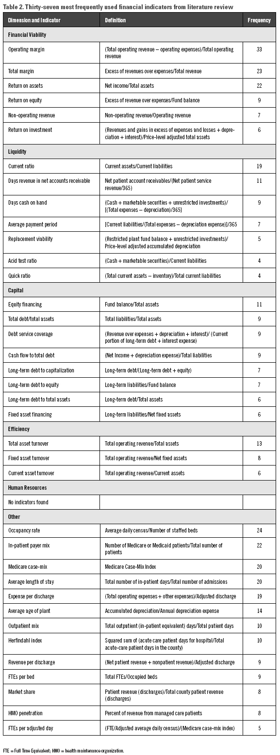 • Literature review. One new indicator from the literature review was selected (debt service coverage). Both total margin and current ratio (retained from the current Hospital Report) were also among the 37 most frequently used indicators from the literature review.