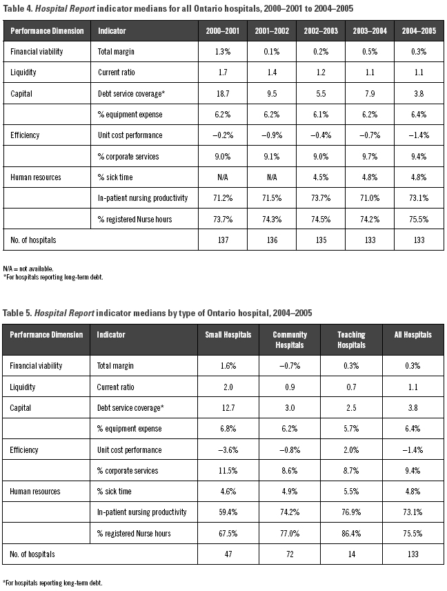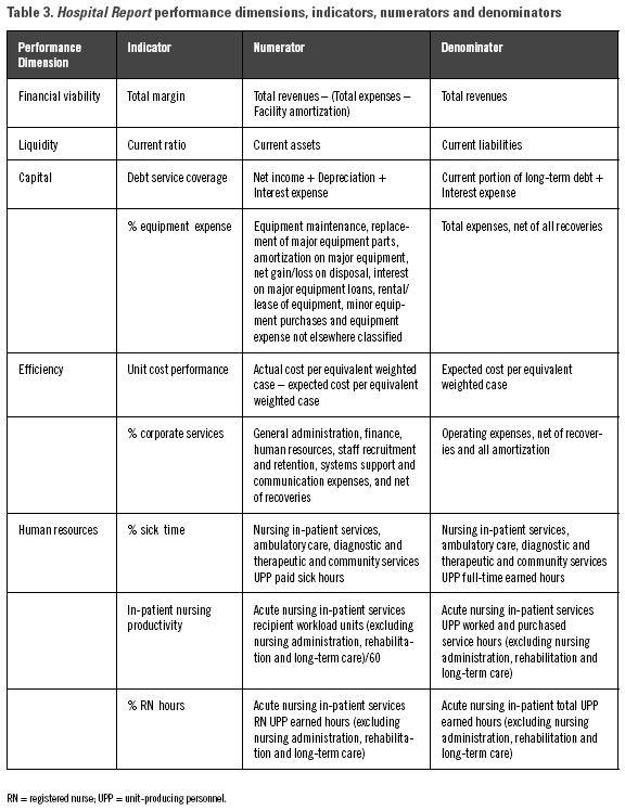 • Current Hospital Report indicators. Seven of the current 12 Hospital Report indicators were retained (total margin, current ratio, unit cost performance, per cent corporate services, per cent equipment expense, in-patient nursing productivity and per cent registered nursing hours).