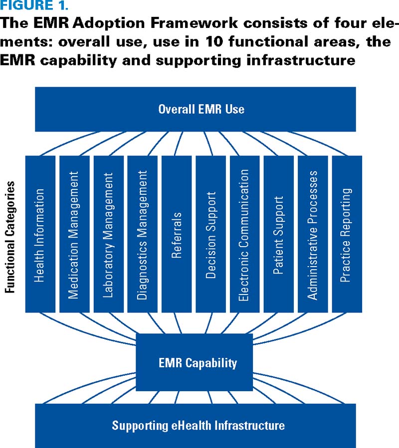 Canada still lags behind many countries in office-based electronic medical record (EMR) adoption (Schoen et al. 2009). There are several new and ongoing activities at provincial and national levels to spur the adoption of EMRs in medical offices. However, one of the missing pieces is a common framework to assess clinical adoption of the EMR within the office.