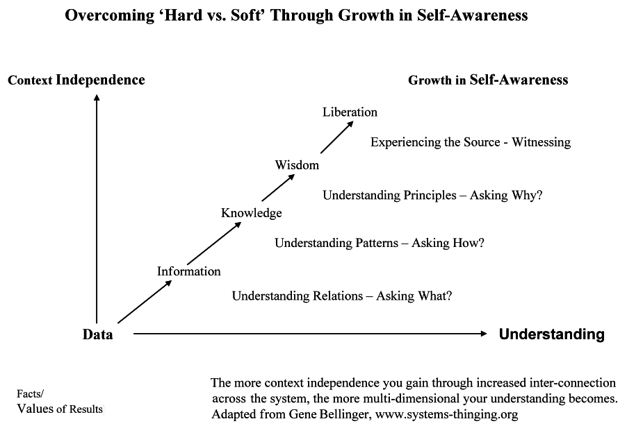 We do not make things in healthcare. We deliver services to people through teams of people. When the relationship patterns are healthy between the providers, magic happens. The “soft” impacts the “hard.” The ability to perceive and evaluate the tacit depths of an environment “within a second” is an empathetic skill. As healthcare continues to operate in a high-velocity context, leaders will have to develop their “blank canvas” capacity – their capacity to sense and go with what emerges from nothing. How do leaders deal with something emerging from nothing? They recognize that individuals, groups and institutions are subject to unconscious processes that support or limit their performance and evolution. To be a transitional leader you must evolve in consciousness, by making the unconscious conscious. Leaders need to recognize early that increasing consciousness in an individual, a team or a system creates the fuel for transformational change. The continuum of consciousness development across the healthcare system and the interconnection between “soft” and “hard” can be illustrated this way: