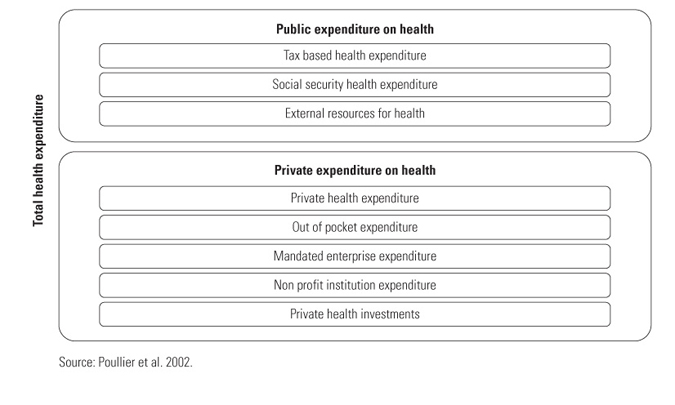 The total healthcare expenditure in a country is usually sourced through a mix of public and private spending, as shown in Figure 1 (Poullier et al. 2002). More reliance on private health expenditures without a mechanism to enforce regulations is likely to promote inequity, inaccessibility and financial hardship in healthcare seeking. Every year, 11% of the population in African and South Asian countries suffers severe financial hardship, and 5% falls below the poverty line. Inappropriate and inadequate financial mechanisms for public health expenditures and low income add an enormous burden on low-income quintiles. Coverage for social security protection in middle-income countries varies from 20% to 60%, compared with 5% to 10% in African and South Asian countries (World health Organization 2005). Since most low-income countries are not on track to achieve MDG targets, the developing an impetus to identify health financing mechanisms that address the coverage gaps for universally accessible health services is critical.