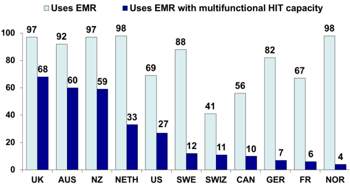Canada ranked second-last among 10 developed countries in EMR use in a 2012 survey by the Commonwealth Report2. Only 10% of physicians in Canada said they used EMRs with multifunctional health information technology (HIT) capacity (“multifunctional HIT capacity” is defined for the purpose of the Commonwealth Report survey as at least two electronic functions for each of order entry management, generating patient information, generating panel information, and routine clinical decision support).