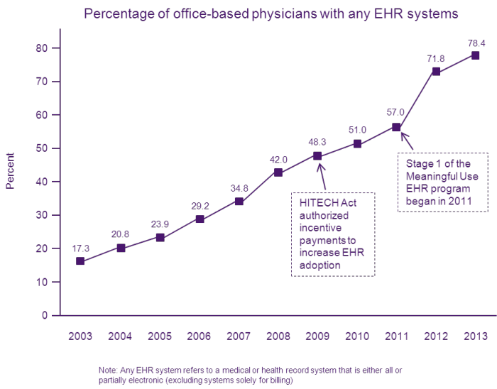 - Hsiao, C., & Hing, E. Use and Characteristics of Electronic Health Record Systems Among Office-based Physician Practices: United States, 2001–2013. NCHS Data Brief, 143. Retrieved , from https://www.cdc.gov/nchs/data/databriefs/db143.pdf