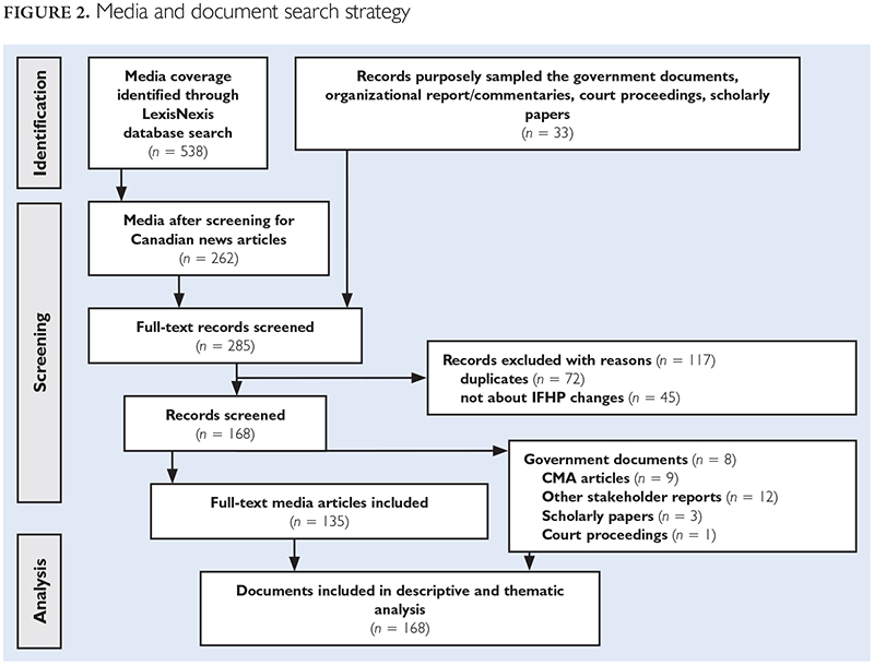 Canadian media reports (n = 262) were identified, and 135 articles were included in this study (Figure 2). News media coverage spanned nine provinces, of which 84% of articles were published in the top 10 newspaper sources (Appendix 1). Documents (n = 33) published after the 2012 IFHP changes and before the introduction of the "temporary measures" to the IFHP in November 2014 were included. A content analysis was employed using a constant comparative approach to abstract themes of problem definition and causal stories, drawing on inductive discursive analysis techniques (Glynos et al. 2009). Triangulation of sources was conducted by assessing the consistency of data themes abstracted from the variety of documents analyzed in this study, strengthening the credibility and trustworthiness of the results (Patton 1999).