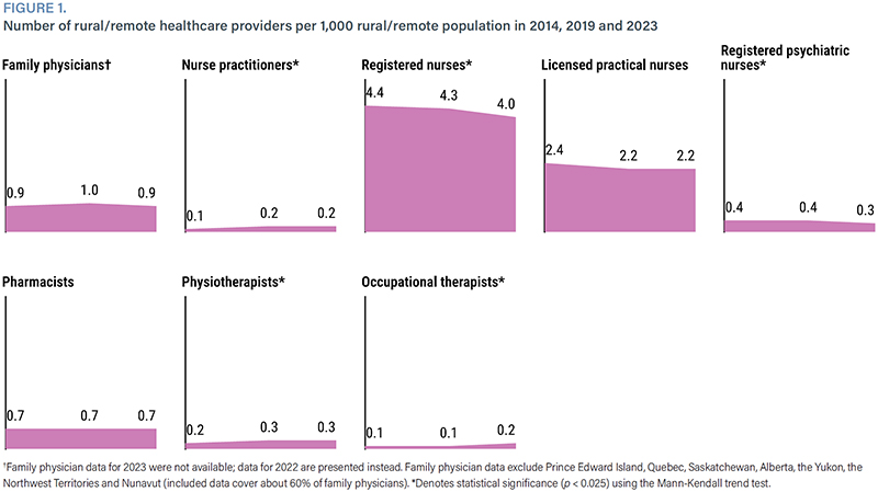 People living in rural/remote areas may experience less access to care compared with those living in urban areas; furthermore, the density of health workers in rural/remote areas is often lower than in urban areas (Clark et al. 2021). As shown in Figures 1 and 2, the density of registered nurses in rural/remote areas (4.0 per 1,000 rural/remote population, or 40 per 10,000 population) was less than half the density in urban areas (80.5 per 10,000 urban population) in 2023 (CIHI 2024b). In addition, rural physicians often serve multiple roles, providing both primary and emergency care in settings such as the emergency department (CIHI 2024a).